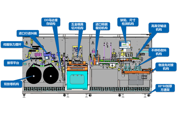 本設(shè)備主要用于方形鋰離子動(dòng)力電池正負(fù)極片的成形,采用五金模具裁切成形,適用于連續(xù)涂布工藝。極片卷料自動(dòng)放卷糾偏,經(jīng)張力控制系統(tǒng),過程糾偏系統(tǒng),引入到模具工位,送料機(jī)構(gòu)牽引輸 送極片,五金模具裁切極片成形極耳。裁斷機(jī)構(gòu)自動(dòng)分切成片,真空皮帶吸附分切后的極片輸 送到料盒內(nèi),自動(dòng)剔除視覺檢測(cè)設(shè)備識(shí)別的不良品。